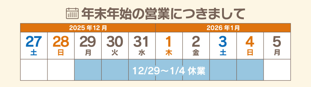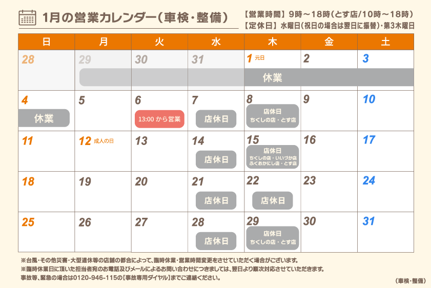 ※HPに記載している割引・特典は、お電話や予約フォームからご予約を頂いたお客様にのみ適用させて頂きます。【年末年始のお問い合わせについて】2025年12月29日〜2026年1月4日の期間について、以下の通りご案内いたします。・お電話でのお問い合わせ:この期間はつながりません。・メールでのお問い合わせ:期間中にいただいたメールは、2026年1月5日以降に順次お返事いたします。お返事にお時間がかかる場合がありますので、お急ぎの方は1月5日以降にお電話にてお問い合わせくださいませ。・車検、整備:この期間は行なっておりません。