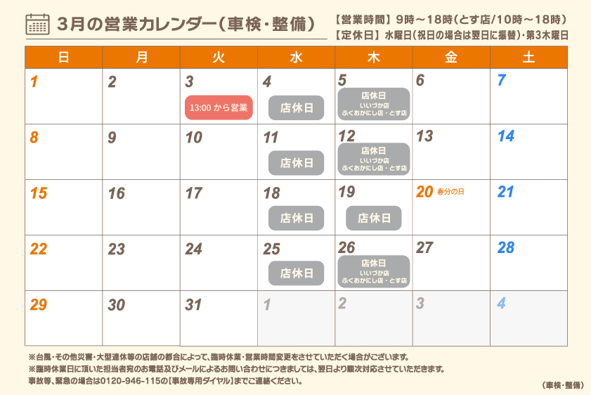0800-816-6453予約済の方、オイル交換・1年点検・修理等